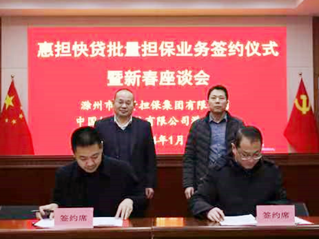 1月18日下午,滁州市融資擔(dān)保集團(tuán)有限公司與中國銀行滁州分行舉行“惠擔(dān)快貸”批量擔(dān)保業(yè)務(wù)簽約儀式暨新春座談會(huì)。市擔(dān)保集團(tuán)黨委書記、董事長、總經(jīng)理高文進(jìn),中國銀行滁州分行黨委書記、行長湯志斌出席簽約儀式,雙方業(yè)務(wù)部門負(fù)責(zé)人以及企業(yè)代表參加。集團(tuán)黨委委員、副總經(jīng)理張健與市中行黨委委員、副行長徐杰代表雙方簽署合作協(xié)議。
