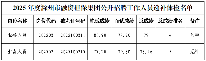 關(guān)于滁州市融資擔(dān)保集團有限公司2025年公開招聘工作人員遞補體檢的公告